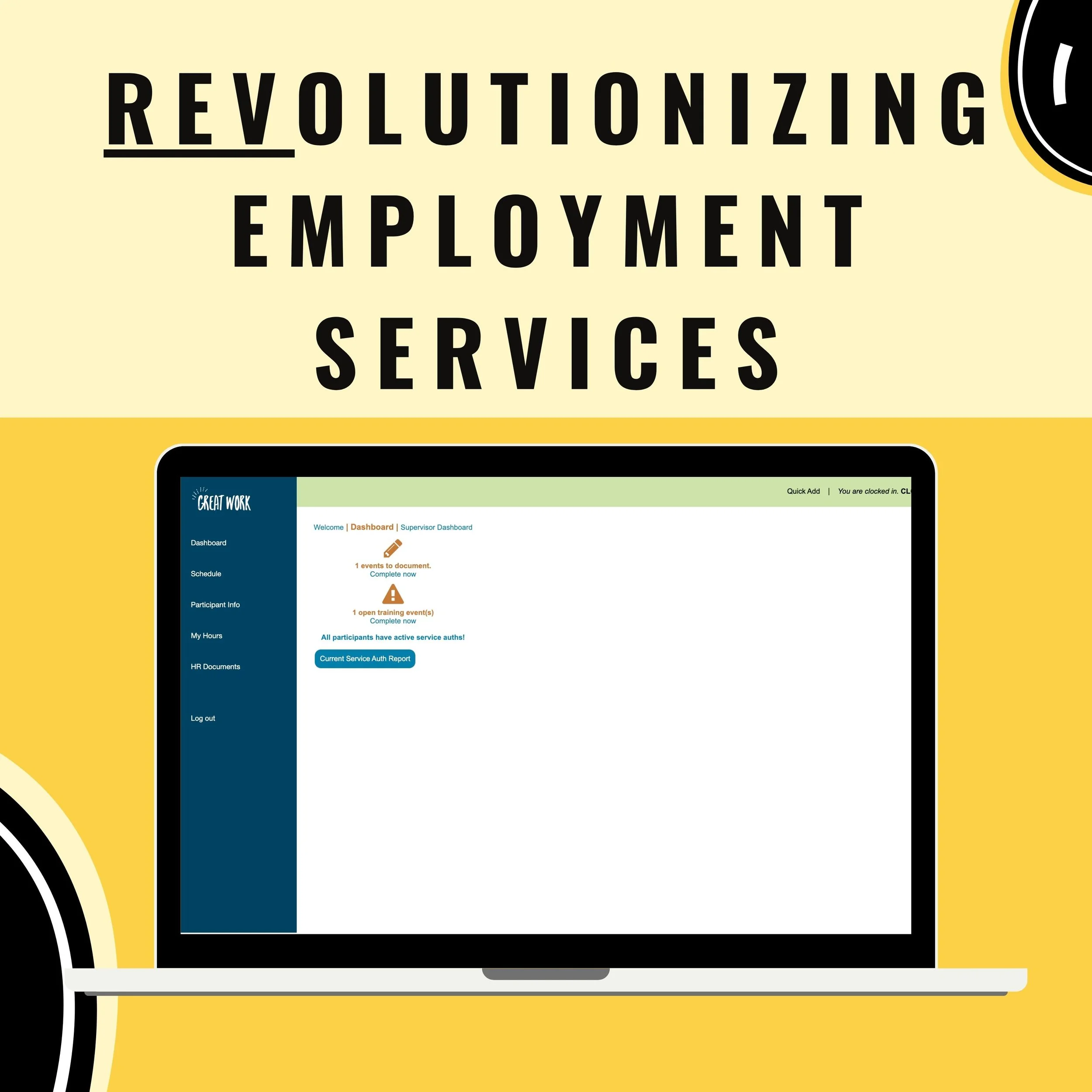 REV is Great Work’s information database. We use this to input documentation, participant scheduled events, update participant information, and time-keep. Log-in using the “Team Login” button in the right hand corner.
